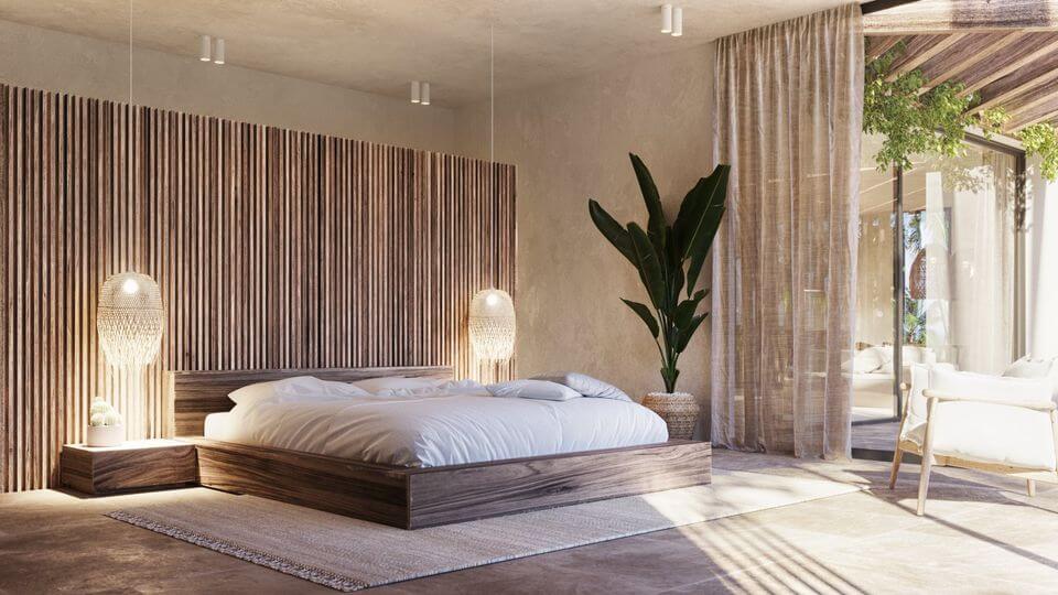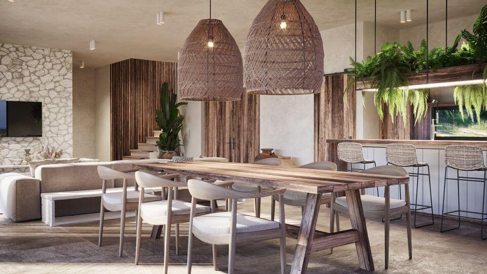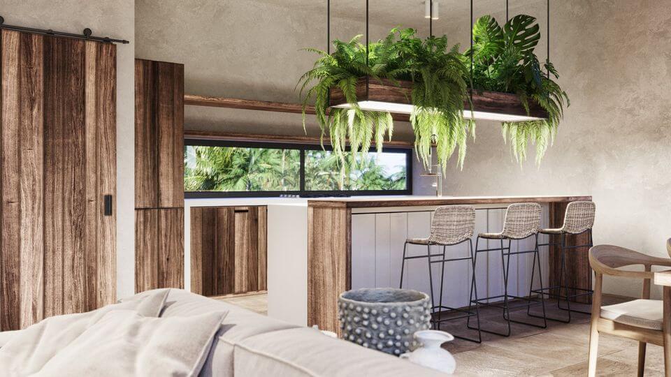 Logement de 65 m², comprenant une chambre double séparée, un salon spacieux avec cuisine ouverte intégrée, une salle de bains et un grand jardin avec vue sur la piscine.